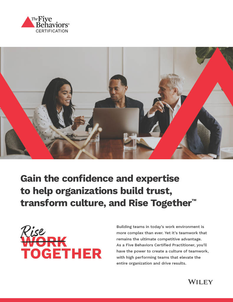 Building teams in today’s work environment is more complex than ever. Yet it’s teamwork that remains the ultimate competitive advantage. Five Behaviors® Certified Practitioners have the power to create a culture of teamwork, with high-performing teams that elevate entire organizations and drive results. The Five Behaviors Certification course is a virtual, two-week, learning experience designed for practitioners who want to deepen their level of expertise in The Five Behaviors and implement this solution within organizations.